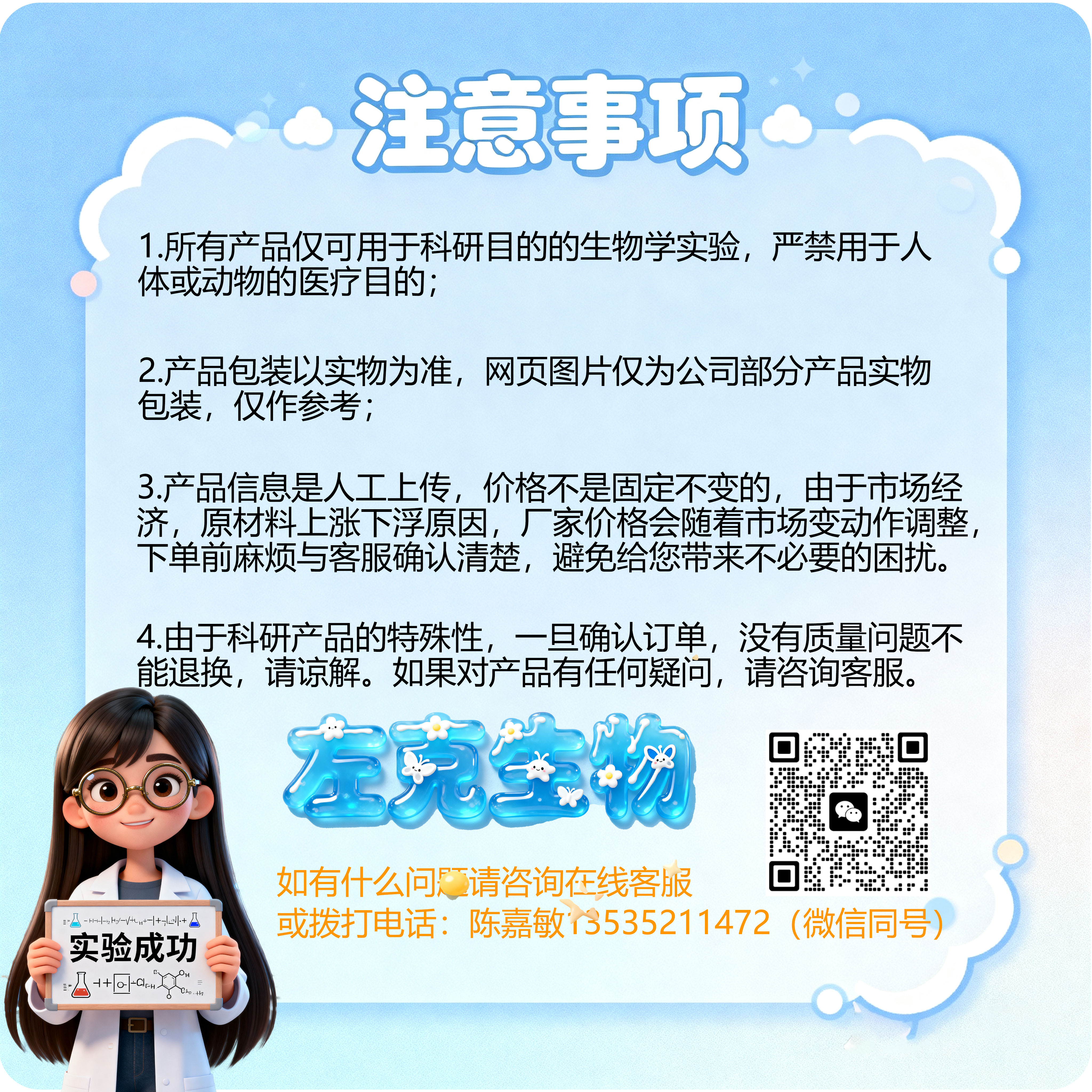 4)由于科研产品的特殊性,一旦确认订单,没有质量问题不能退换,请谅解。如果对产品有任何疑问,请咨询客服,谢谢。